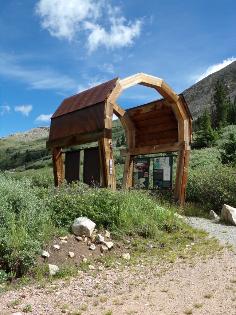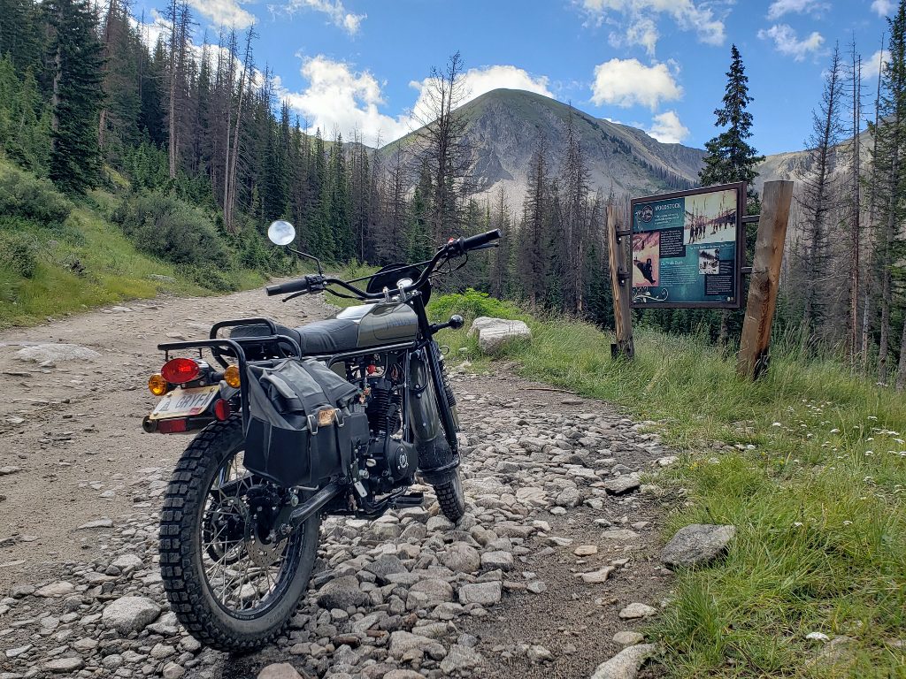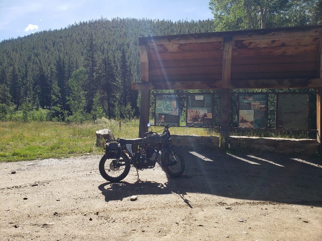 At Parlin, I turn down County Road 76, a paved road with a 45 mph speed limit. It wanders to and fro around the countryside, and the Gryffin is right at home moseying along at or below the speed limit. I soon pass through Ohio City (spoiler alert: it’s not a city!) and then on to Pitkin. Pitkin is where the pavement ends and the fun begins. I make my way through town and head out Forest Service Road 765, a fairly smooth, unpaved road. The landscape is definitely getting a bit more rugged by now, and after rounding a corner I see what I am looking for – Forest Service Road 839, the road to the Alpine Tunnel. There is a nice display at the junction telling about the area: