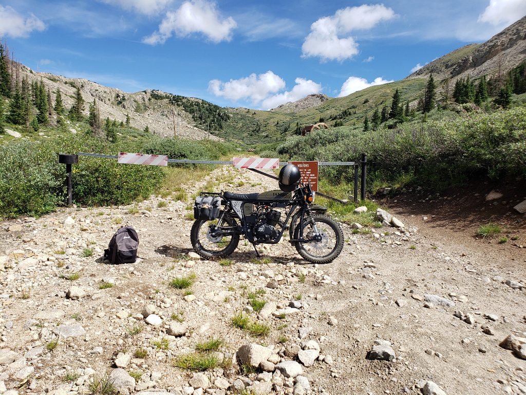 I eventually climb back on the bike and make my way upgrade. I carefully pass a couple of hikers, and before long I arrive at the Alpine Tunnel Historical Site. The site itself is off-limits to motorized traffic (for good reason), so I park the bike in front of the gate and take a quick picture:
