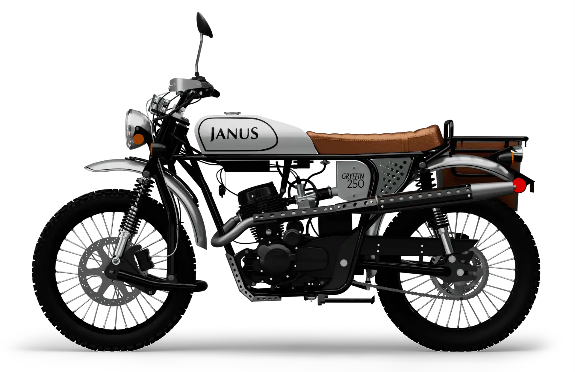 The Gryffin 250 comes standard with everything that you need to be initiated into the Janus experience: a beautiful, featherweight, handmade motorcycle ready to ride. Add as much customization and personalization as you want for a truly one-of-a-kind scrambler build.